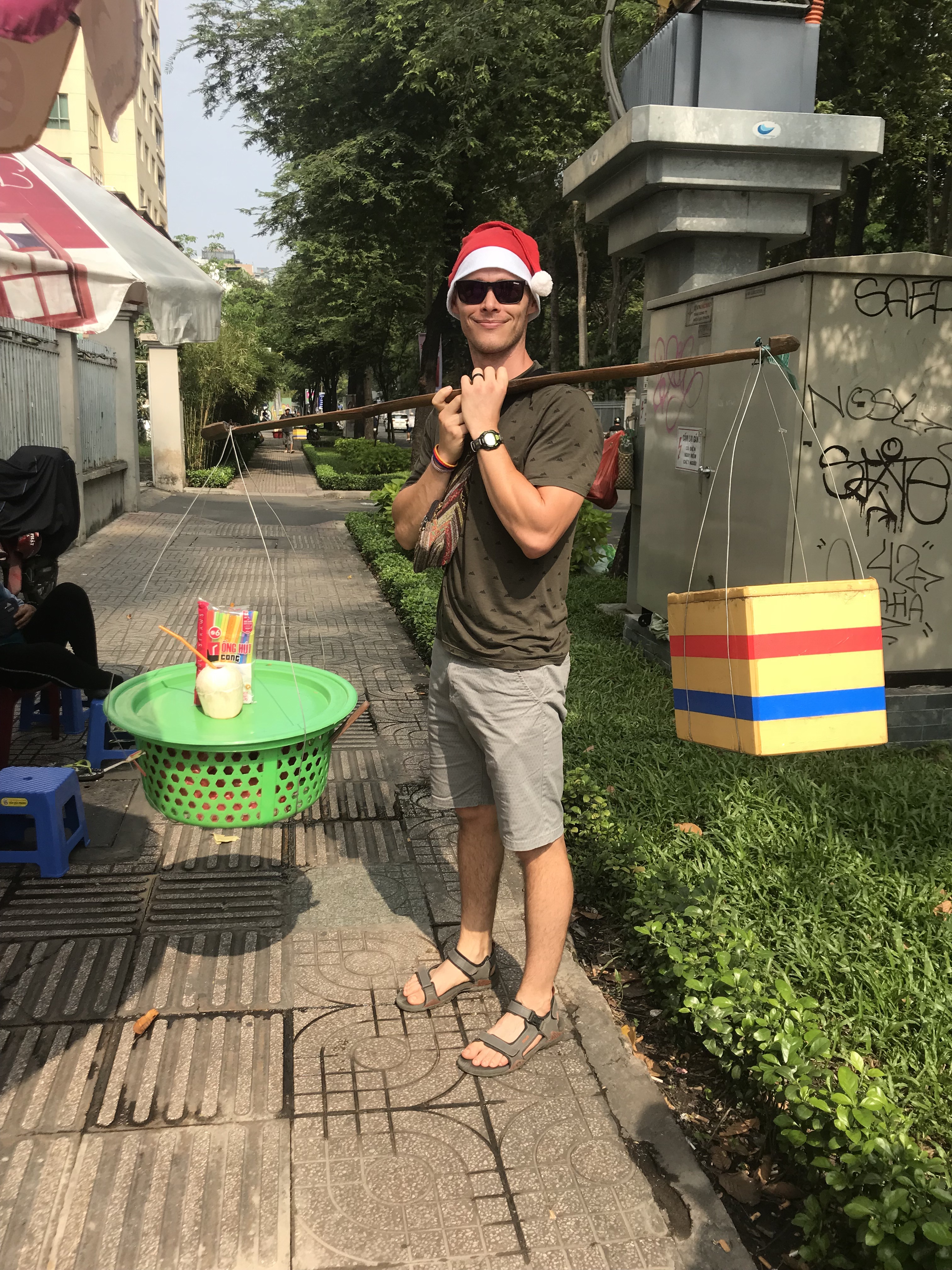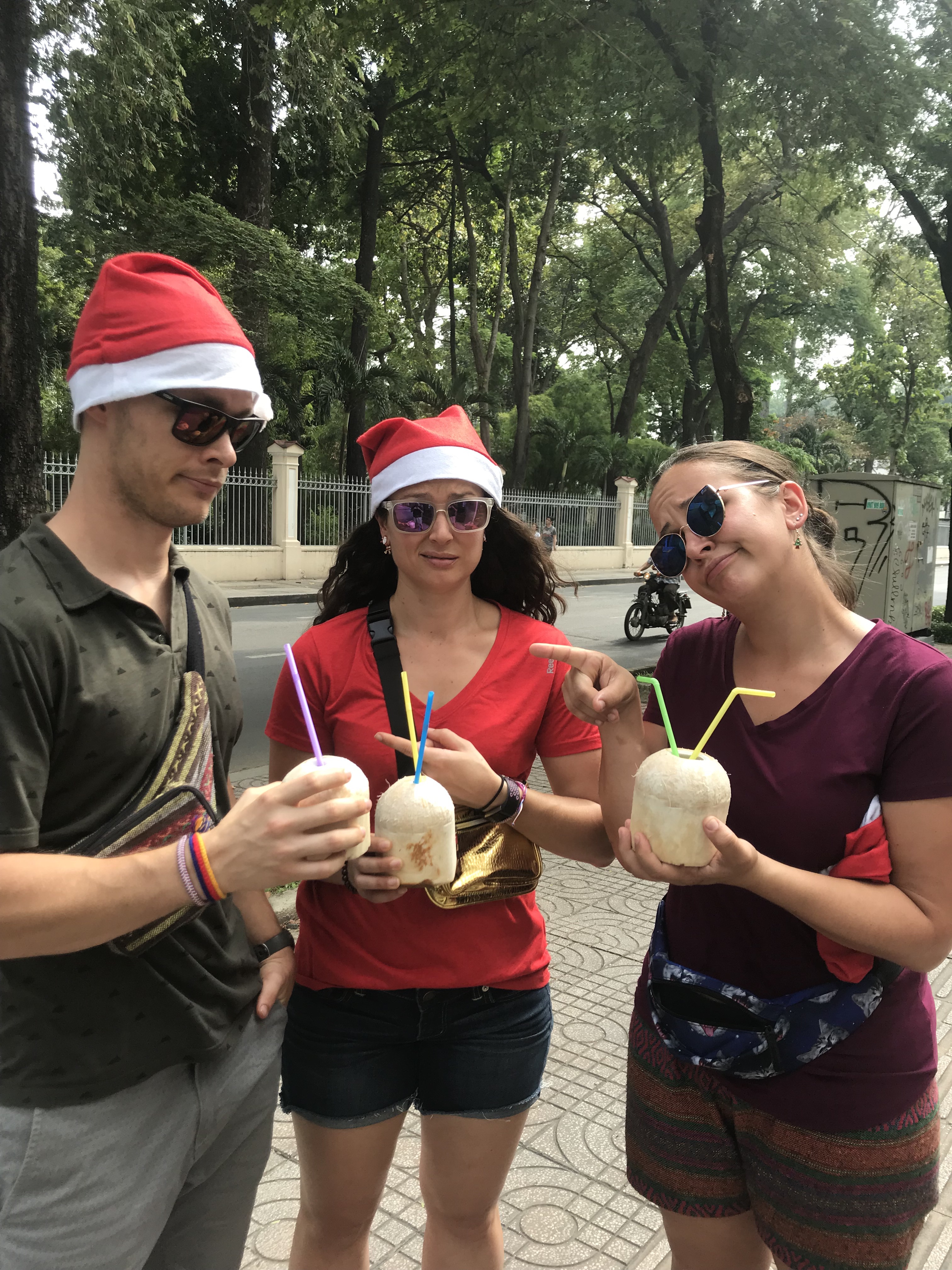 Anyway, back to Shane. We are walking down the road on our way to the War Remnants Museum, and like so many others that day, this man waved and pointed at the hats and said Merry Christmas. We returned the gesture, and the next thing you know he’s asking for a picture with Shane. Then he wants Shane to hold the coconut contraption, and before you know it he’s hacked off the top of 3 coconuts (to drink the coconut water) and is asking for the equivalent of $16 USD.