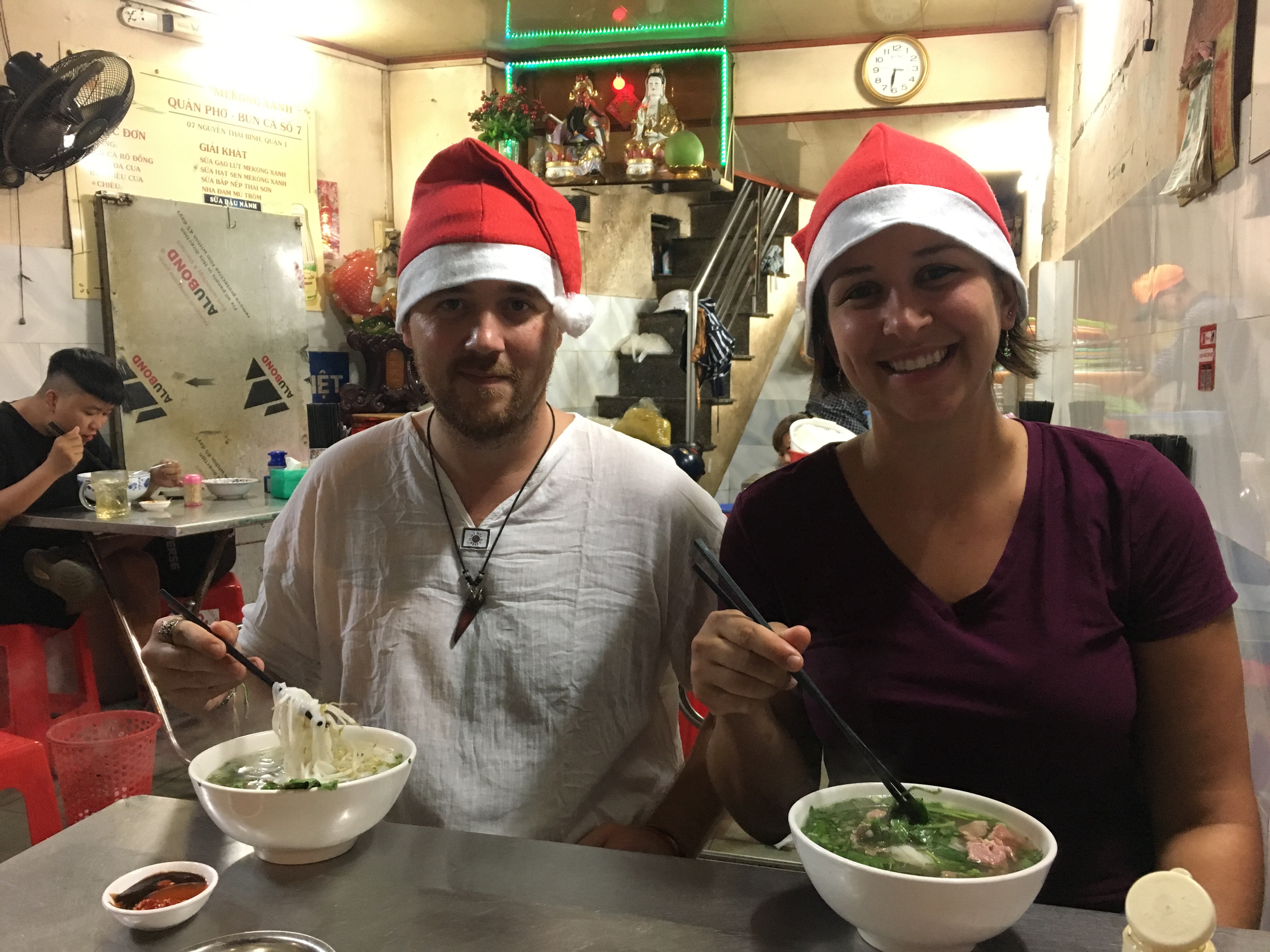 We arrived in HCMC on Christmas Eve, so I unpacked the Santa hats and off we went. First stop… PHO!