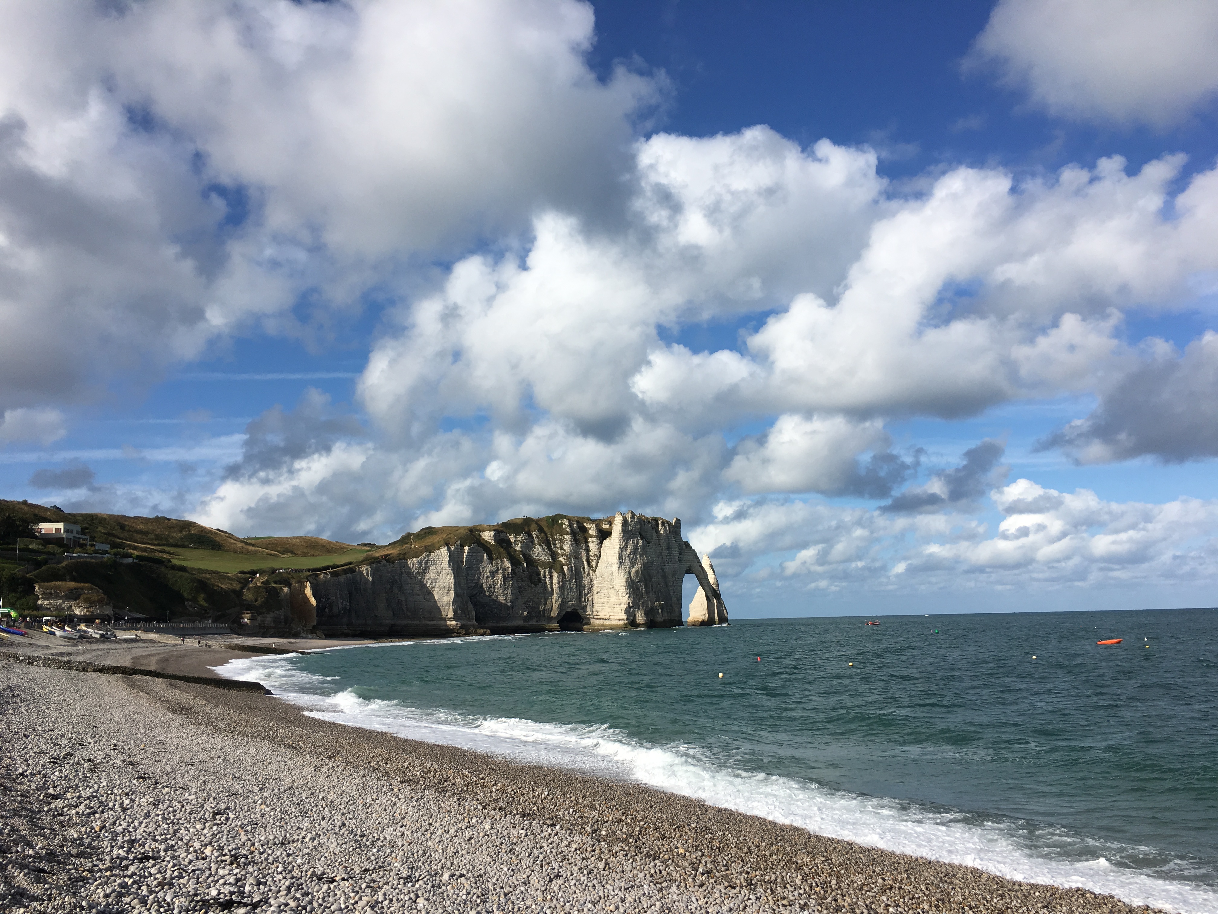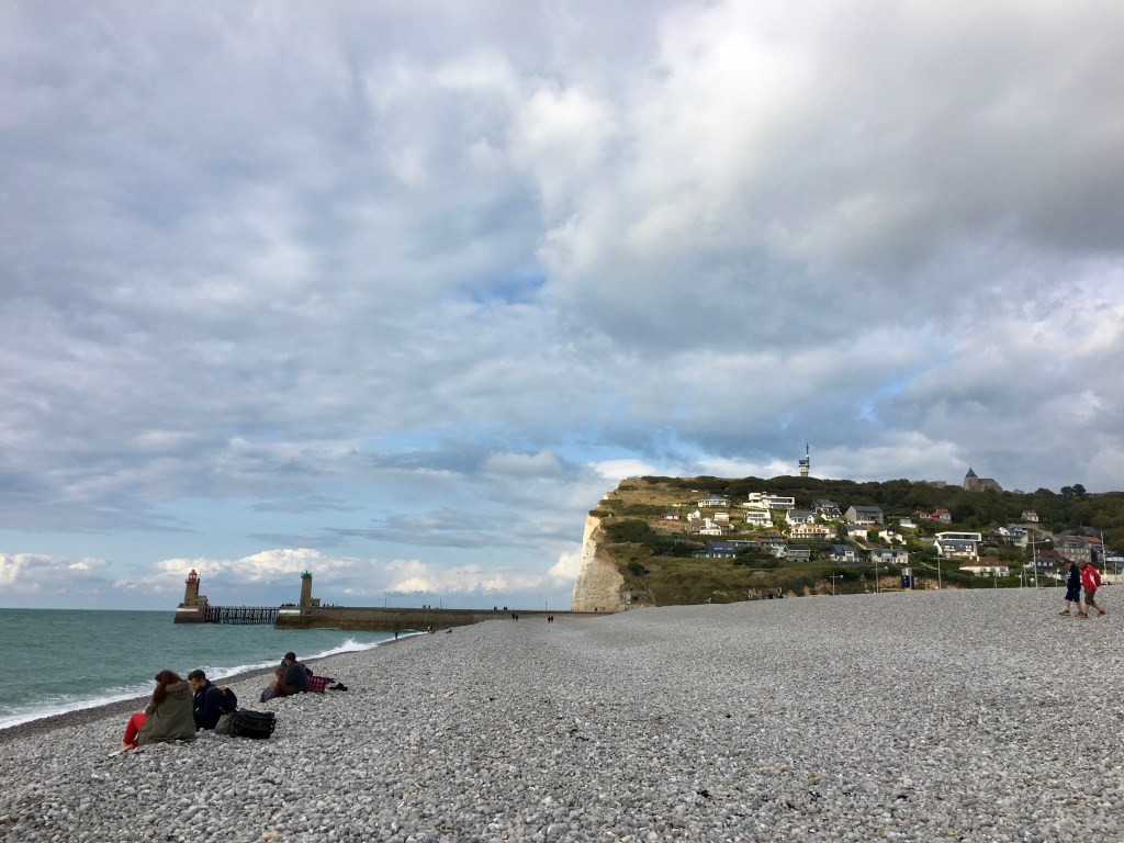 The other unique thing about both Fécamp and Étretat are the “pebble” beaches. I say “pebble” because some of them were flat-out rocks. The pebbles are created from the soft white chalk cliffs that make up a 125 km (80 mile) stretch of coastline called La Côte d’Albâtre (the Alabaster Coast) where these two towns are located. Over time, they are perfectly polished by the waves. The sight and, oddly enough, the sound of the water moving through them was a new experience for both of us!